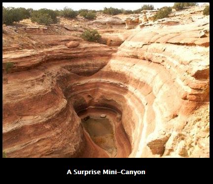 This is a great part of Route 66, driving at the base of red sandstone bluffs, and past Owl Rock. The road wound around an extremely tight turn and up a hill, where I spied a little dirt road on my left and decided to explore it. I bounced down a sandy little hill and onto a sandstone wash. I decided that this was as good a place as I was going to find for my late lunch, so I turned off the ignition and opened up my cooler. I sat on my tailgate eating a turkey sandwich and watching a train roll by in the distance, with not another soul around. After my peaceful meal, I decided to wander around on foot. I quickly found myself at the edge of the sandstone bluffs, overlooking a narrow valley on my left, and small canyons on my right. This is a great spot, and I will definitely stop here again.